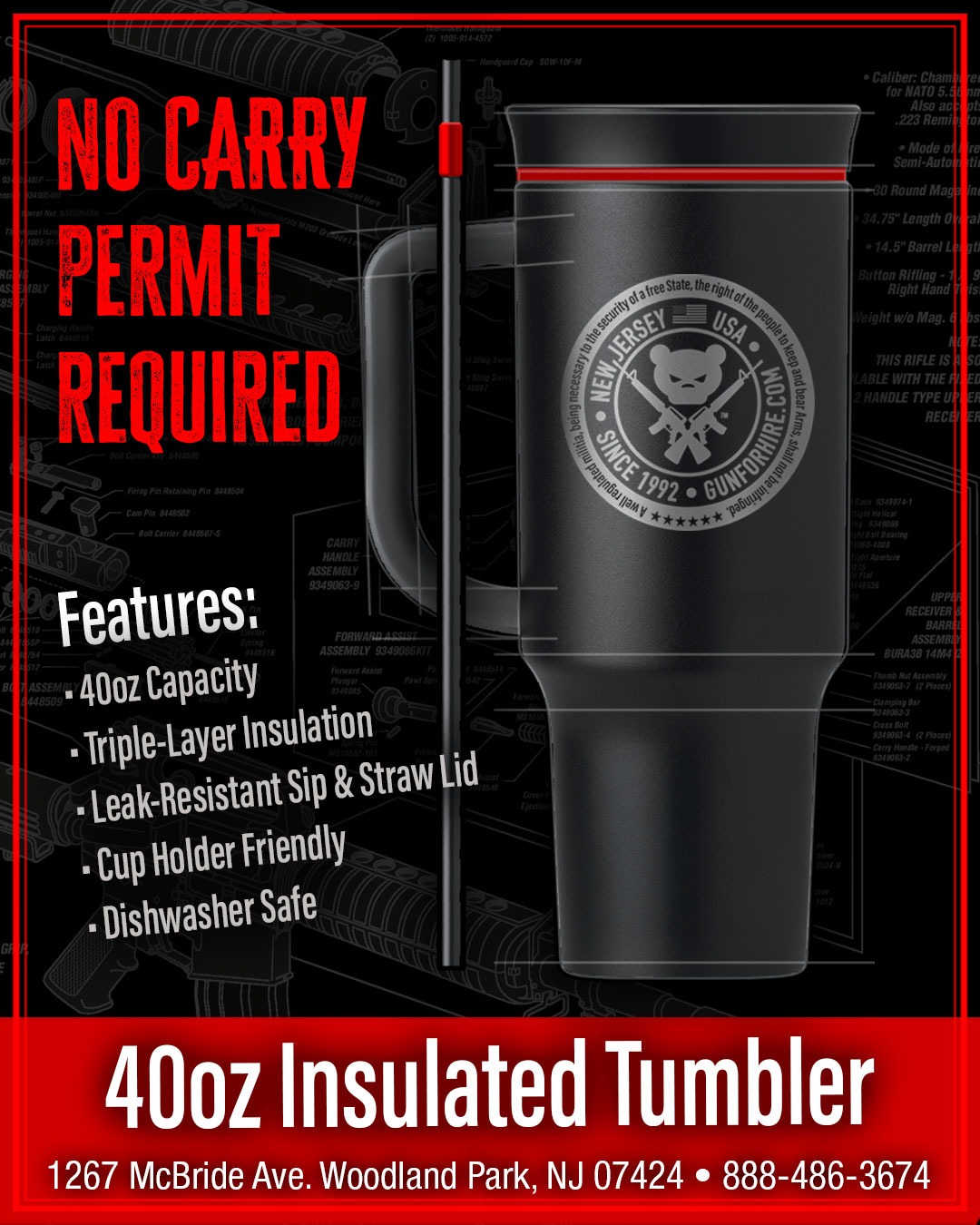 Introducing the 40oz Gun For Hire Tumbler — your new everyday sidekick built for range days, road trips, and everything in between. Designed with a sturdy handle, a sleek GFH-branded finish, and a convenient straw for effortless sipping, this powerhouse tumbler keeps your drinks ice-cold or piping hot for hours. Durable, stylish, and proudly representing America’s Only 6-Star Gun Range, it’s the perfect way to stay hydrated while showing off your GFH pride. Grab yours and carry the spirit of the range wherever you go!