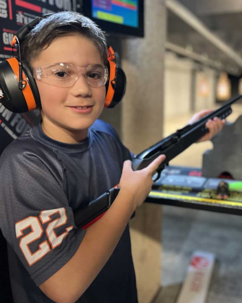 Young guest learning in a supervised indoor shooting range environment with proper safety gear